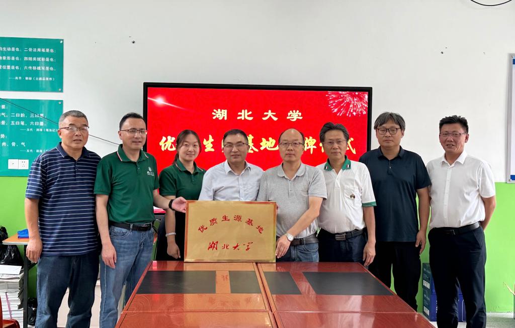 湖北大学化学化工学院院长张修华代表湖北大学为蕲春实验高中颁授“湖北大学优质生源基地”牌,蕲春实验高中校长何亚龙代表学校接牌,与会领导及教师代表共同见证了授牌仪式。
