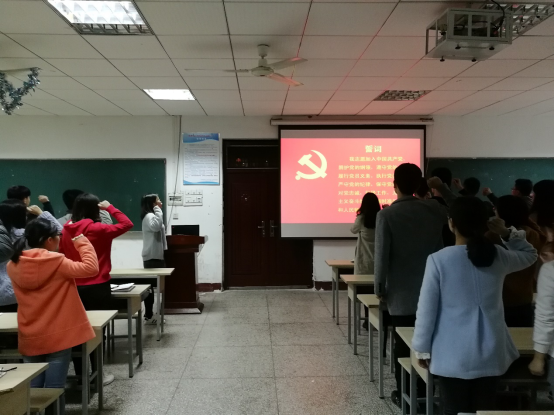 会议伊始,全体党员起立,重温入党誓词。