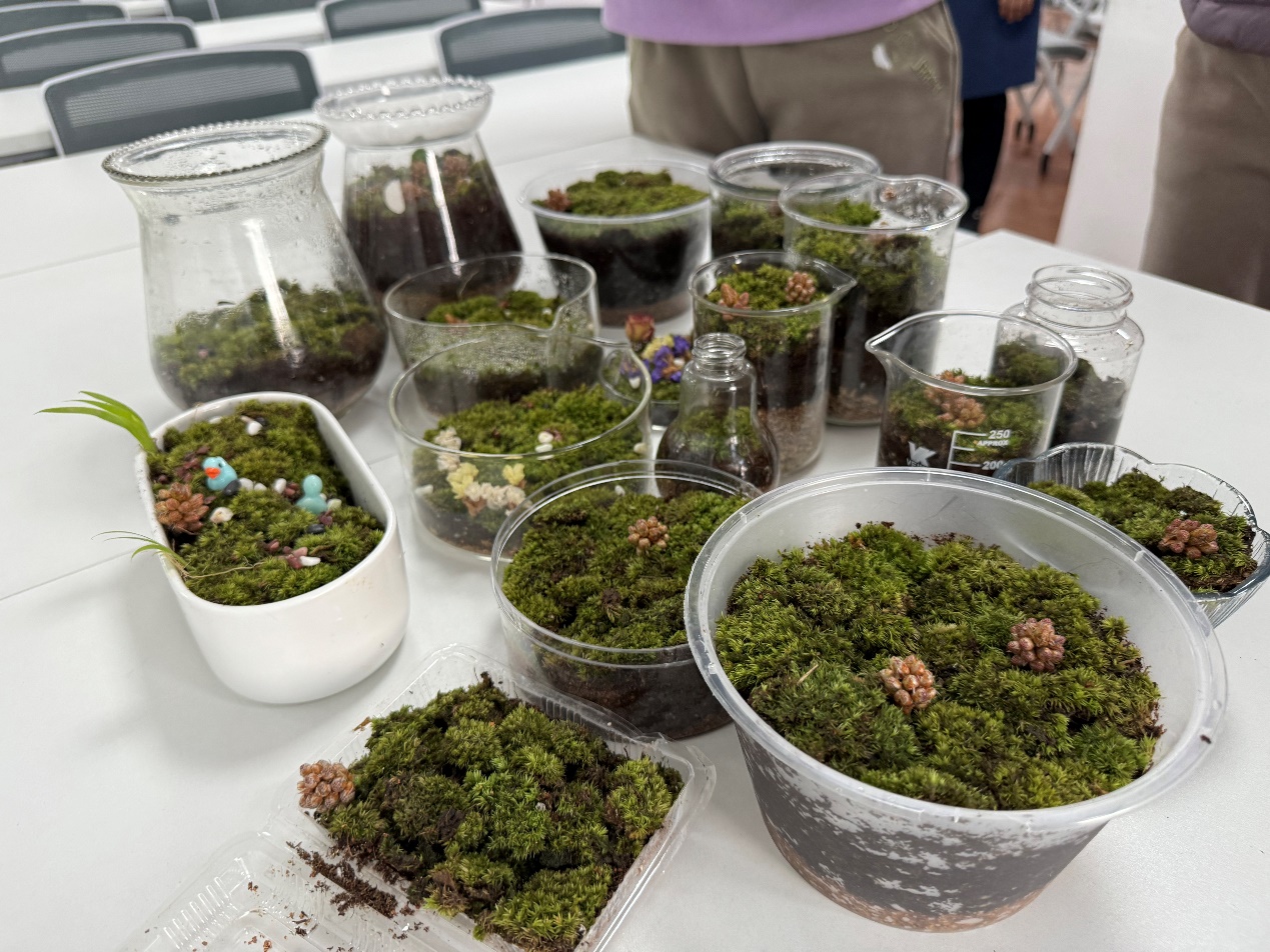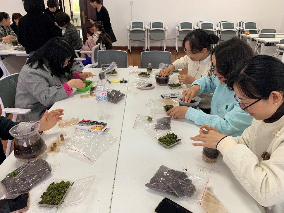 本次活动的压轴环节,当属DIY苔藓微景观了。当老师们拿出自己准备的容器时,再次将欢乐的气氛点燃,原来这些容器中既有老师们工作中经常用到的烧杯、玻璃槽,也有吃完水果后特意留下的塑料包装盒,还有沙拉碗、烘焙瓷盘等厨房餐具,以及各种别致造型的玻璃容器,尽显参与者作为化学工作者、家庭女主的职业眼光和生活担当。铺底石→覆盖土壤→植入苔藓→创意布景,老师们边创作边交流,在慢节奏的创意手作中放松身心。苔藓虽小,但微小中亦见蓬勃生机。