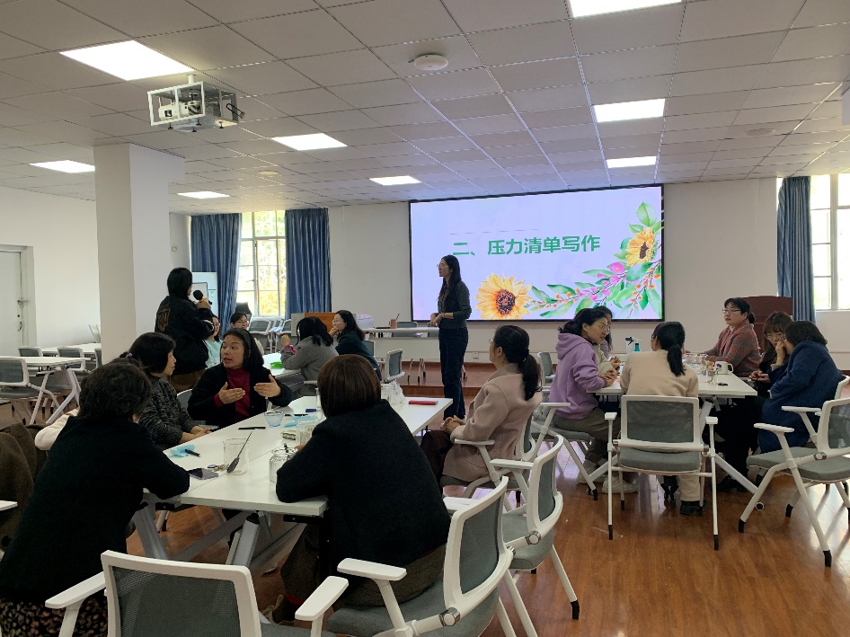 活动在滚雪球——微笑握手中拉开序幕,参与活动的老师按照指令随机组合后,当面说出对方三个特点,参与者在欢声笑语中建立信任,促进了解;在压力清单写作环节,参与者匿名书写近期压力事件,投放在桌上的压力区,组内成员随机领取一张清单,在纸条背面写下解压建议,先组内后组间分享并展开讨论,使参与者舒缓焦躁情绪的同时,也深切感受到了同事间的温情。