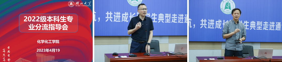 4月19日晚,湖北大学化学化工学院2022级本科专业分流指导会在通识教育学院B212和B300教室举行。化学化工学院领导林二友书记、张修华院长,化学系主任李玲、化学工程与工艺系主任龙华丽、应化系主任汪航行、化学生物学系副主任翁玥、制药工程系主任潘洁老师,教师代表李法宝、刘建文老师,毕业生代表李昊杰、王兴宇以及2022级化学化工学院同学参加此次指导会。本次会议旨在增进大一学生对化学化工学院各专业的了解,为即将到来的专业分流提供帮助和指导。