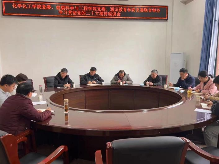 下午16:00,在阳逻校区会议室,化学化工学院兼健康科学与工程学院党委书记林二友,化学化工学院院长张修华、副书记刘念、副院长任君,健康科学与工程学院院长刘志洪、副院长王凯,通识教育学院党委书记焦新曦、副书记韩凯、副院长向祖慧、办公室主任彭显彪参加三院联合举办的学习贯彻党的二十大精神专题座谈会。