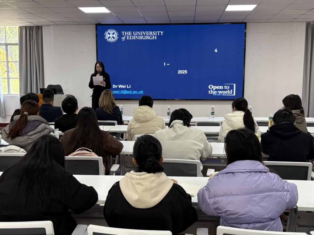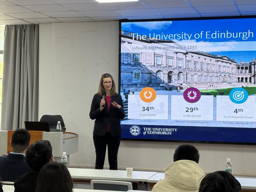 随后,爱丁堡大学国际招生负责人Francesca Coates女士为我院师生介绍了爱丁堡大学的悠久历史、学术氛围以及化工专业的独特优势。她详细讲解了与湖北大学联合培养项目的课程安排、费用构成及申请流程等内容。在互动环节,同学们围绕专业选择、申请准备与学业规划等问题踊跃提问,现场气氛热烈。Francesca Coates女士与李伟副教授对师生的热情参与表示感谢,并期待未来进一步拓展合作空间。