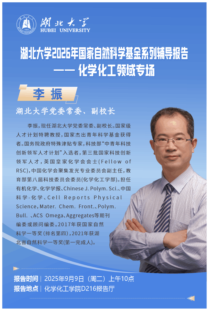 李振,现任湖北大学党委常委、副校长。国家级人才计划特聘教授,国家杰出青年科学基金获得者。国务院政府特殊津贴专家,科技部“中青年科技创新领军人才计划”入选者,第三批国家科技创新领军人才,英国皇家化学会会士(Fellow ofRSC),中国化学会聚集发光专业委员会副主任,教育部第八届科技委员会委员(化学化工学部)。担任有机化学、化学学报、Chinese J.Polym.Sci.、中国科学-化学、Cell Reports PhysicalScience,Mater.Chem.Front.、Polym.Bull.、ACS omega、Aggregates等期刊编委或顾问编委。2017年获国家自然科学一等奖(排名第四),2021年获湖北省自然科学一等奖(第一完成人)。