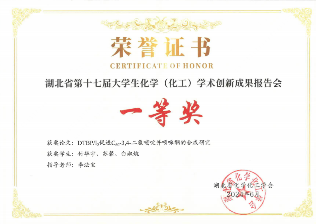 付华宇,中共党员,2021级化学(师范类)专业本科生,保研至南开大学化学学院。现任班级学习委员,曾任化院青志秘书部负责人。前三学年加权成绩排名专业第一,连续三年获一等优秀学生奖学金以及国家奖学金、一等金献师范生奖学金、文体活动奖学金等8项奖学金;获三好学生标兵、优秀共青团员、三好学生、优秀志愿者等多个荣誉称号。获省级大创2项、湖北省化学化工学术创新成果报告会一等奖,以第一发明人获实用新型专利一项,以第二作者在省级期刊上发表学术论文一篇,以参与者在《SCIENCE CHINA Materials》期刊上发表学术论文一篇。