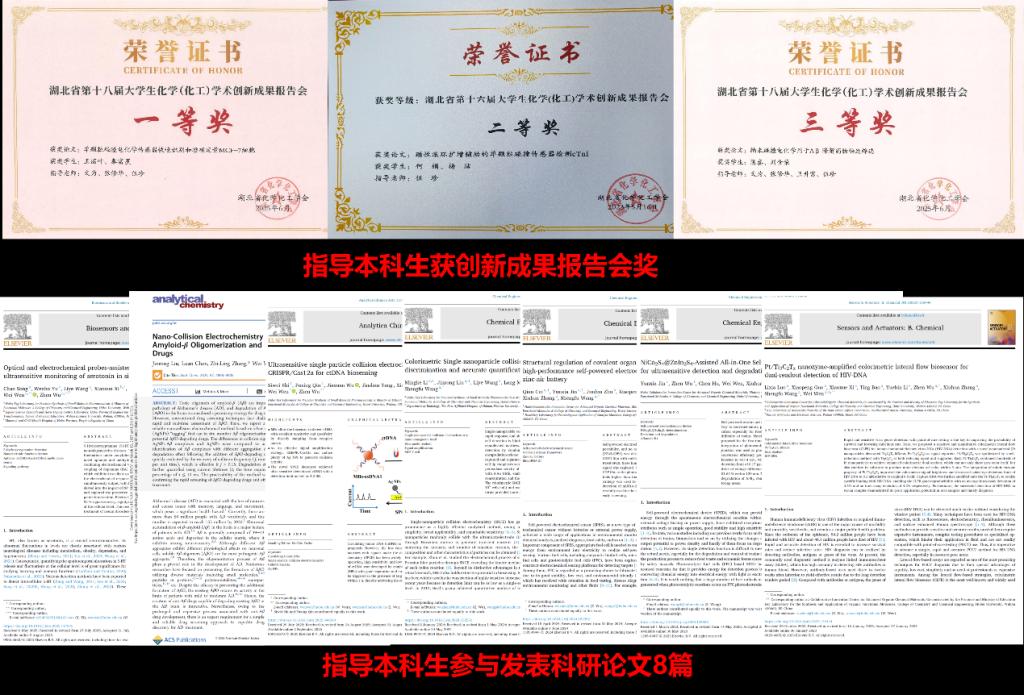 伍珍教授不仅在教学上匠心独运,在科研反哺教学方面也有着独到见解。作为湖北省“楚天学者”、博士生导师,她始终将前沿科学研究与教学过程深度融合,为学生搭建从理论到实践的桥梁。她主持国家自然科学基金面上项目和青年项目等8项科研项目,在电化学生物传感研究领域取得了丰硕成果,发表教科研论文30余篇。